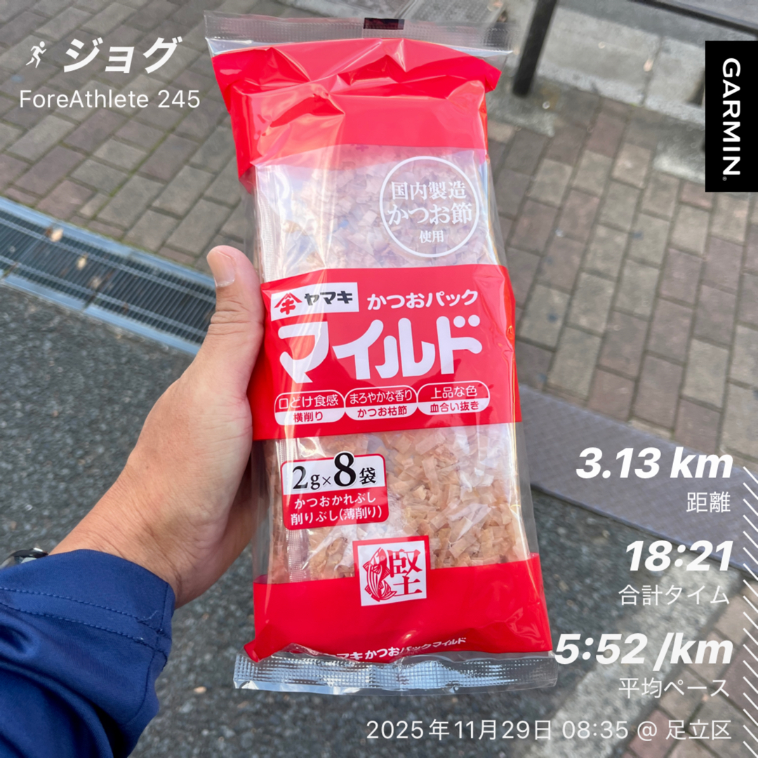 脚の具合もいまいちなので、キャンプ前に鰹節を買いにお使いジョグ。