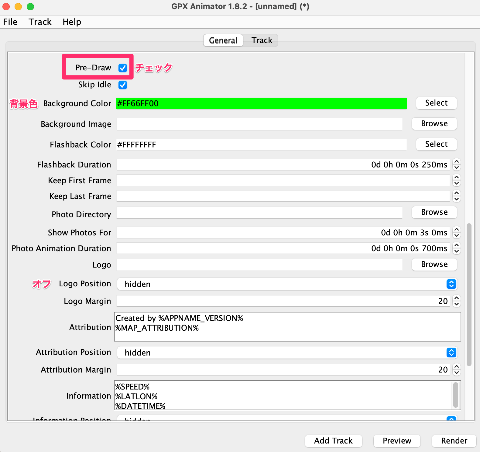 - あらかじめ走るコースを表示させたい場合はPre-Drawにチェック。